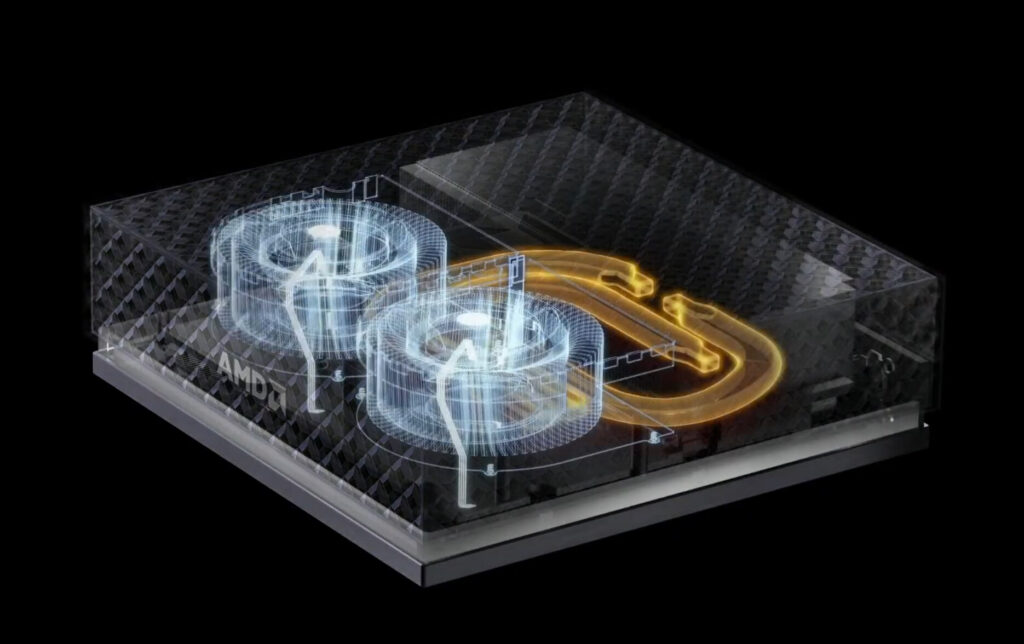 To manage heat in such a small design, AMD created a custom cooling solution. It uses a metal baseplate, flat heatpipes that touch the chip directly, an aluminium channel style heatsink, and two side mounted fans. This design keeps temperatures stable during long workloads while maintaining a compact form.