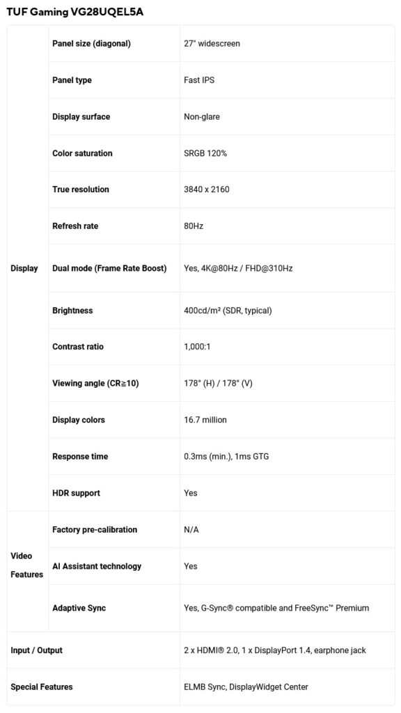 The TUF Gaming model is designed for more regular users. It still offers Dual Mode, allowing switching between 4K at 80 Hz and Full HD at 310 Hz. It also focuses on smooth motion, reducing blur and screen tearing during gameplay. Colours are bright and clear, making it a good option for both gaming and creative work.