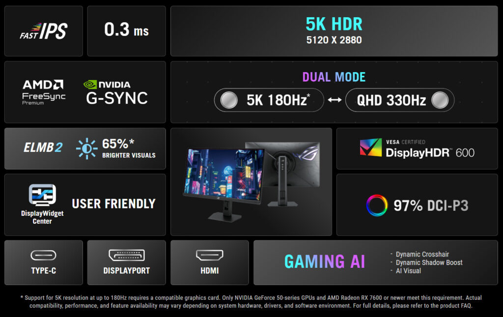 The port selection is a bit unusual. The monitor only includes DisplayPort 1.4 for the main high-resolution connection, while two HDMI 2.1 ports support consoles and other devices. The USB Type-C port has mixed information on the product page some parts say it supports DP Alt mode and 15 W charging, while others say it is only for firmware updates. The monitor also comes with a USB 3.2 hub with three ports and a headphone jack. To enjoy full 5K at 180 Hz, Asus notes that gamers will need a powerful graphics card like the NVIDIA GeForce RTX 50 series or an AMD Radeon RX 7600.