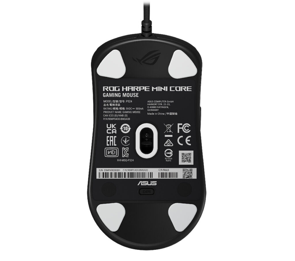 Inside, the ROG Harpe Mini Core is powered by a 12,000 DPI optical sensor that ensures precise tracking with smooth performance. It includes ROG Micro Switch II, which can be swapped out when needed. The mouse supports speeds up to 300 IPS and 35G acceleration — a simpler setup compared to the ROG Harpe Ace Mini but still great for competitive play.
