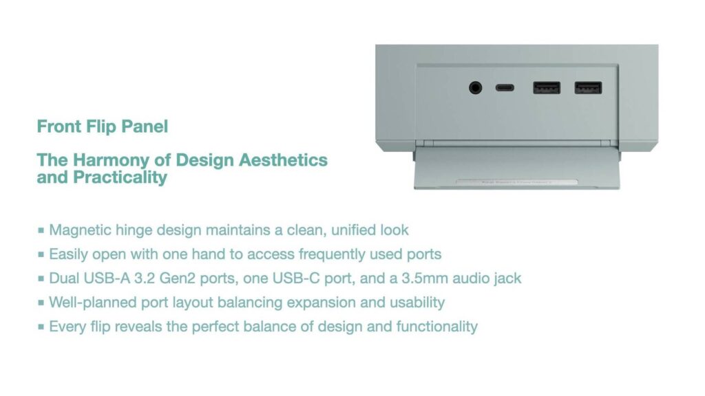 A special feature of the AM03 is its foldable front panel. This panel hides the front ports when they are not needed, keeping the front clean and organised. When opened, users get quick access to ports for daily use. This design helps keep the desk neat while staying practical.