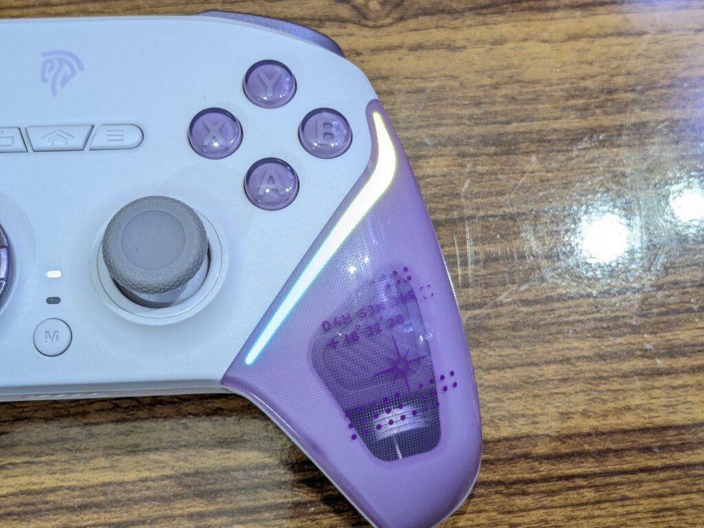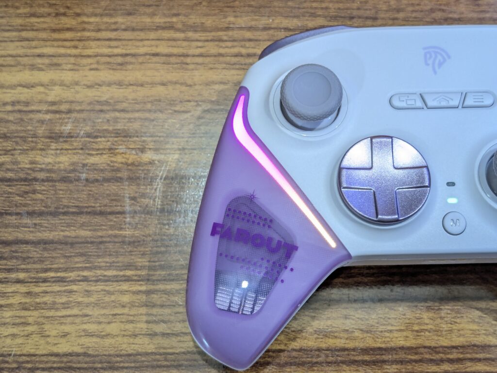 The Farout Purple edition has a bright white front shell paired with transparent purple grips on the sides. These grips have a fine engraved texture that gives a secure and comfortable hold during long gaming sessions. The semi-clear design also lets you see the vibration motors inside, adding a subtle but eye-catching touch.