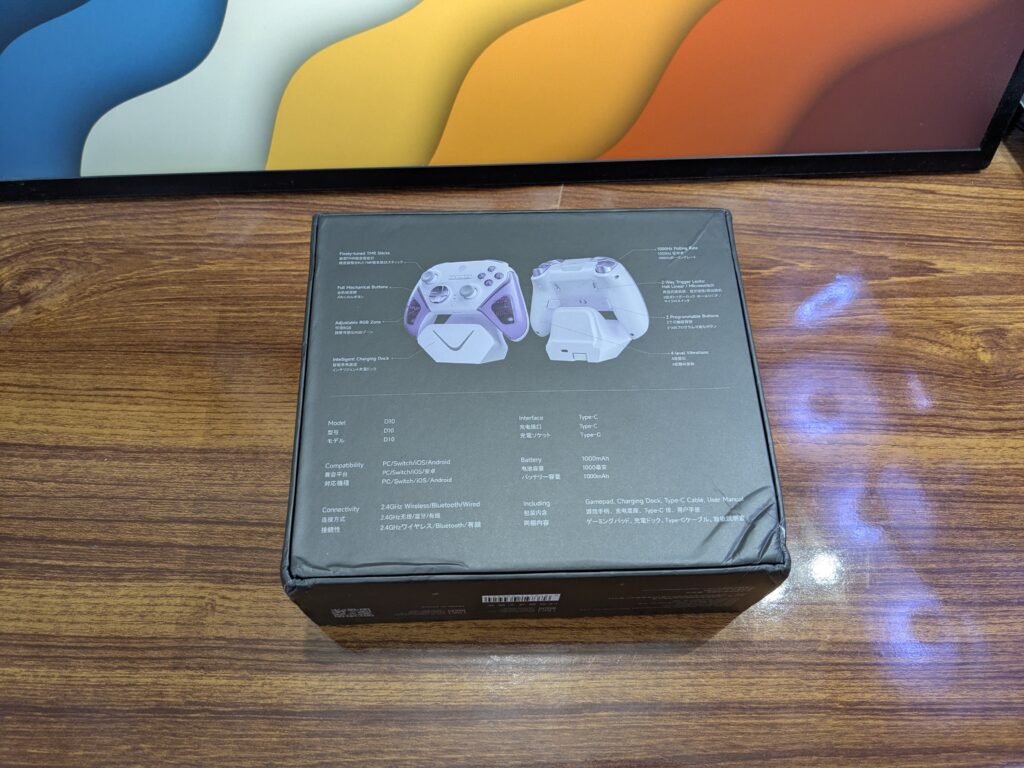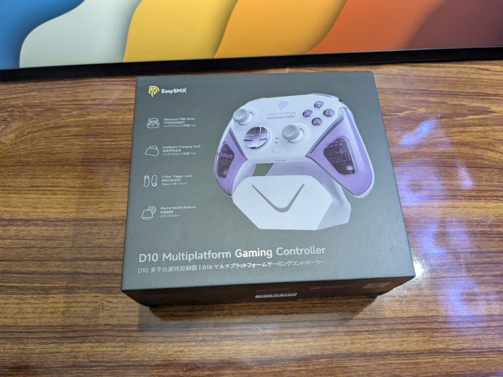 The EasySMX D10 comes in a solid grey box that feels premium as soon as you pick it up. On the front, there’s a large, clear picture of the controller with its charging dock, along with the EasySMX logo. The main features, such as TMR sticks, mechanical buttons, and trigger locks, are printed right on the front so you know what makes this model special.