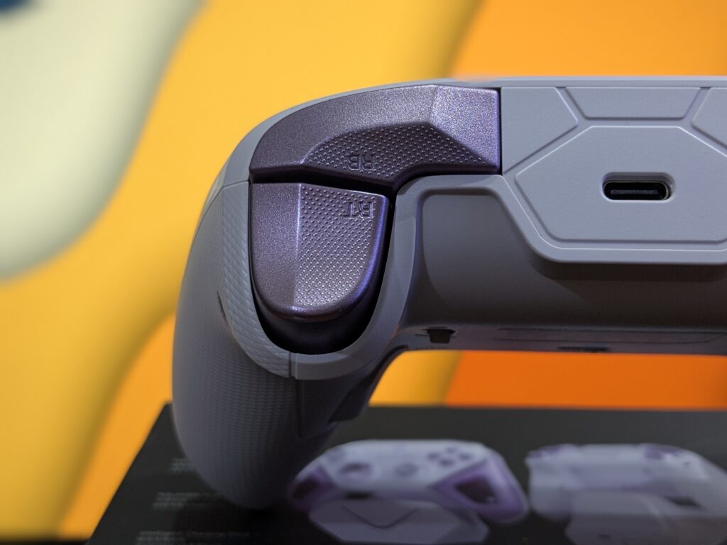 The triggers use Hall Effect sensors for smooth, accurate control. Each one has a lock switch — the full-range mode is perfect for gradual inputs like acceleration in racing games, while the short-click mode works best for rapid actions in shooters.