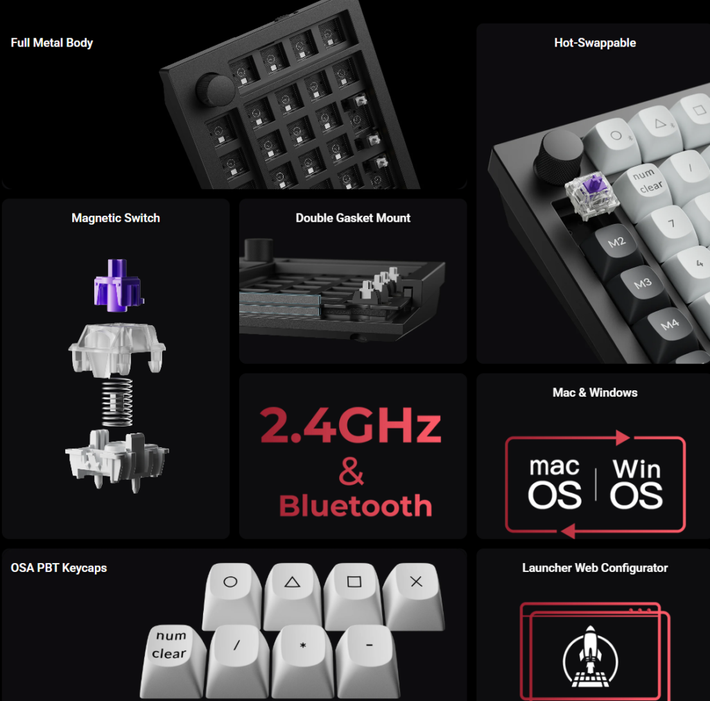 Inside, the Q0 HE uses a gasket mount and multiple foam layers to reduce noise and improve key feel. It runs on QMK firmware and supports full customisation. The polling rate reaches 1000 Hz when connected through USB C or 2.4 GHz wireless, while Bluetooth is also available for everyday use.
